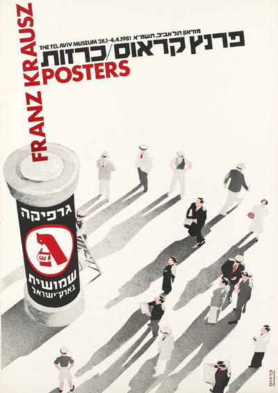 Exhibition of posters designed by Franz Krausz (1905-1998) in the Tel Aviv Museum, Israel. Entwurf Franz Krausz, Israel 1980 unter Verwendung seines Umschlagentwurfs von ca. 1937 für eine Israelische Reklame-Zeitschrift.