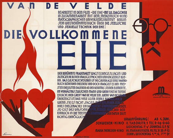 Originaltitel „Die Ehe“. Österreichisches Uraufführungsplakat zum Film über die „seelische und sexuelle Technik der Ehe“ von 1928/29 des Verlages Wissenschaftlicher Filme GmbH, Berlin. Regie Eberhard Frowein. Darsteller u.a.: Lil Dagover, Hanna Waag, Maria Solveg, Hertha von Walther. Plakatentwurf Victor Th. Slama, Österreich 1929. Druck Münster & Co., Wien.