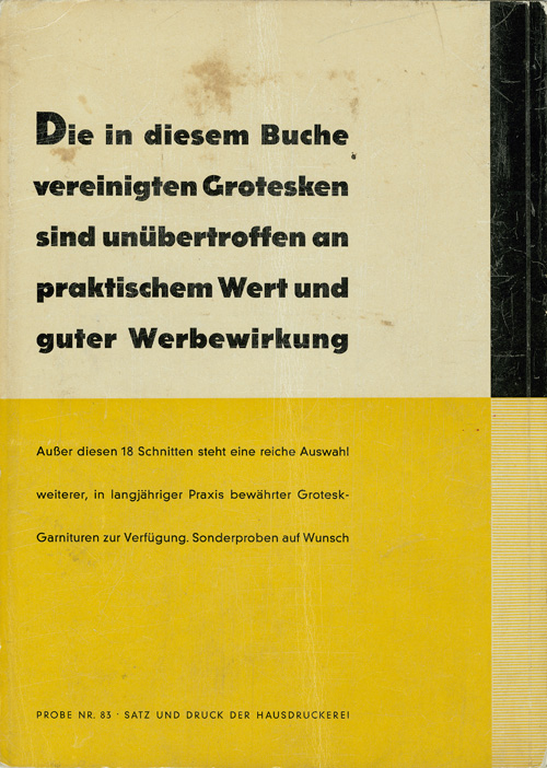 Inhalt: 1. Reform-Grotesk B (10 Schnitte; Hausschnitt ab 1904), 2. Elegant-Grotesk (4 Schnitte; Schriftentwurf Hans Möhring 1928), 3. Neuzeit-Grotesk (4 Schnitte; Schriftentwurf u. a. Wilhelm Pischner 1928), 4. Plak (3 Schnitte; Schriftentwurf Paul Renner 1928). An die Teile 1-4 (26 Blatt) schließen sich auf 26 Blatt Anwendungsbeispiele der 4 Schriften an. Davon die Schrift „Plak“ auf 3 Blättern, die sich auf doppelte Breite ausklappen lassen (Kleinplakate).