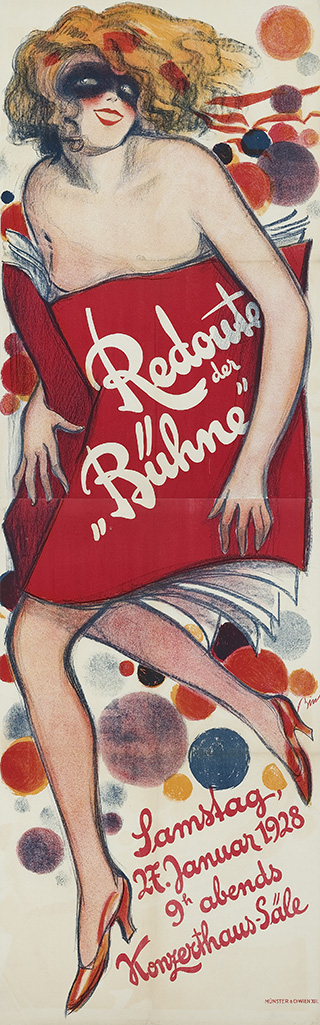 Gefaltet, Randeinrisse an der vertikalen Faltstelle oben und unten. Farbabb. in Christian Maryska: Alles Walzer. Redouten-, Gschnas- & Ballplakate. Wien 2007. S. 153, Kat. Nr. 61.