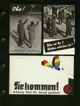37 Blatt Karton mit zahlreichen Originalobjekten wie: Prospekte, Kleinplakate (Abb. 18-26), Etiketten, Briefbögen- und Umschläge,