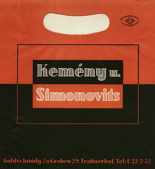 Firmen: Schoeller-Bleckmann (Stahlwaren), Das Buch der Wünsche (Schmuck/Uhren Brüder Zirner), Orig.-Entwurf Katalogumschlag „Die Moderne Uhr (Zirner; Abb. 18-19), Koloman Handler (Ringbücher), Industrielle Tierpflege (Firma Anton Bauer), Heimbautal Al- Mi-Ta Vermittlung, Donau-Europa Zeitschrift, Neue Schule für Bewegungskunst Hilde Holger und Grete Kollmann (lose), Arthur Schütz Kupplungen, Der Hankomann (Koloman Handler), Durolith Farbe (Firma Englaender), Ringbuch Marke Luxor (Koloman Handler), C. Ash & Sons, Privatklinik Dr. Müller Karlsbad (auch Varianten),