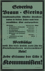 Plakat der KPD (verantw. Hugo Eberlein) zu den Landtagswahlen in Preußen am 7.12.1924. Anonymer Entwurf, Deutschland 1924. Druck J. Windolff, Berlin. Größe 67,1 x 42,5 cm.