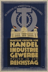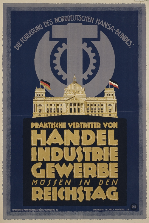 Plakat des Norddeutschen Hansa-Bundes, Hamburg zur Reichstagswahl 1920. Entwurf von Halberts Propaganda-Büro Hamburg, Deutschland 1920. Druck H. Carly, Hamburg. Größe 90 x 60,2 cm.