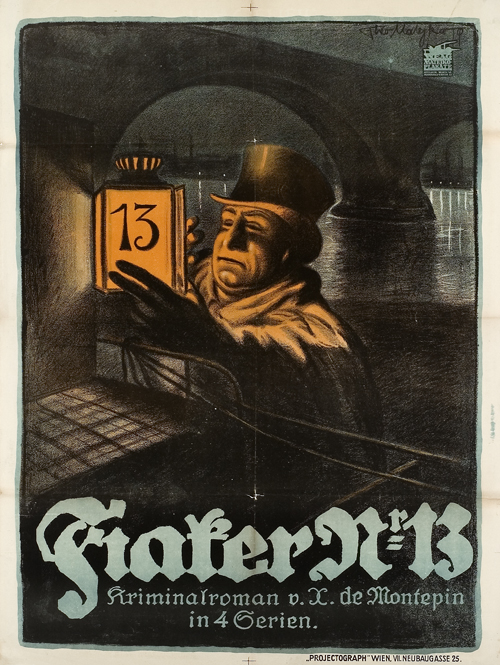 OT: Il Fiacre n. 13 [Teil 1-4]. L: Italien. J: 1917. R: Alberto Capozzi u. Gero Zambuto n. d. Roman v. Xavier de Montépin. D: Helene Makowska. P: SA Ambrosio Film, Torino. V: Projectograph AG, Wien. Plakat zur Uraufführung der Filmserie, Frühjahr 1919 in Österreich. Entwurf Atelier Theo Matejko, Österreich 1919. Druck Waldheim-Eberle AG, Wien (WEAG). Größe 126,3 x 95 cm.