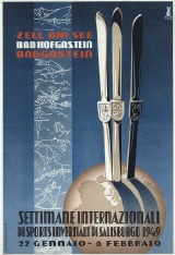 Internationale Wintersportwoche Salzburg 1949. Zell am See, Bad Hofgastein, Bad Gastein. Entwurf Gumpold (Bad Gastein), Österreich 1949. Offsetdruck Sochor, Zell am See. Größe 80,9 x 55,1 cm.