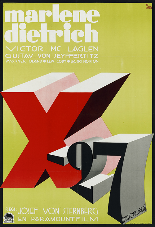OT: Dishonored. L: USA. J: 1931 (UA 5.3.1931). R: Josef von Sternberg. D: Marlene Dietrich, Victor Mc Laglen, Gustav von Seyffertitz. P: Paramount Pictures Corporation. Plakat: Gösta Åberg, Schweden 1931. Druck A.-B. Offsettryck, Stockholm.