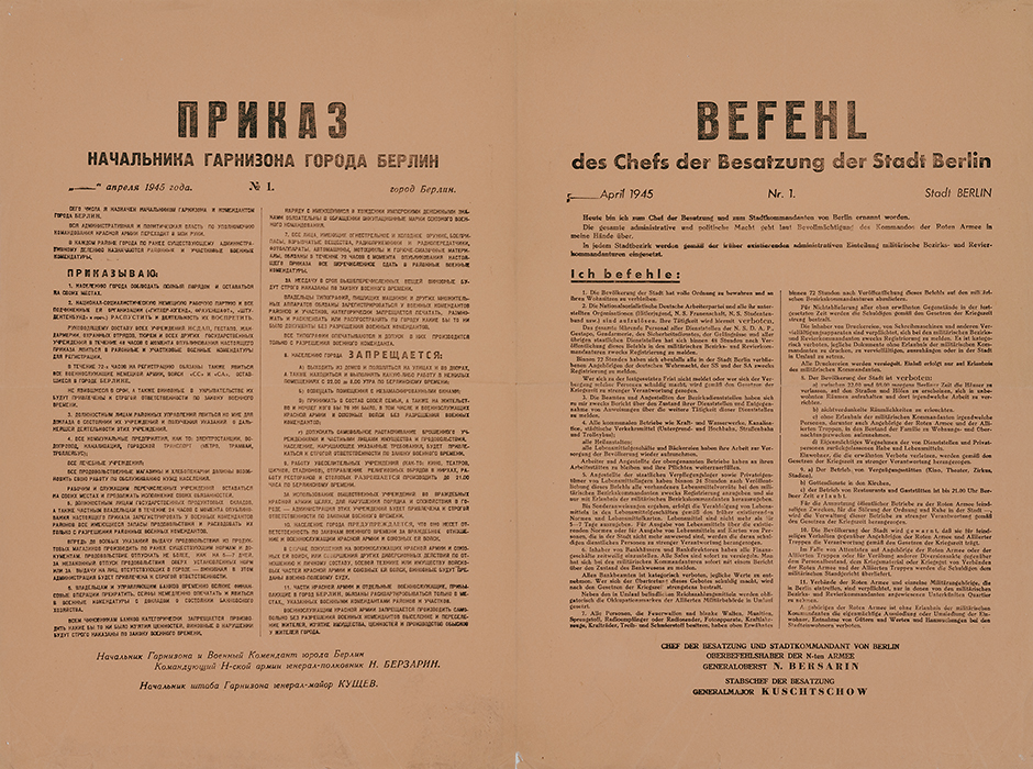 Sowjetische Stadtkommandantur, Berlin-Friedrichsfelde. Ohne Druckvermerk, UDSSR/Deutschland 1945. Größe 48 x 63 cm. Befehl in russischer und deutscher Sprache. Rückseite unbedruckt.