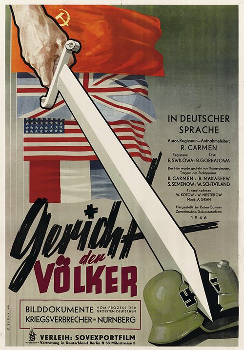 OT: Sud Narodow. L: UDSSR 1946. R: R. Karmen, J. Swilowa. P: Rotes Banner Zentralstudio für Dokumentarfilme. V: Sovexportfilm Moskau, Berlin. Plakat: Nikolai Chomov (Khomov), UDSSR 1946. Druckvermerk: A/13556 M 169. Größe 98,4 x 68,2 cm.