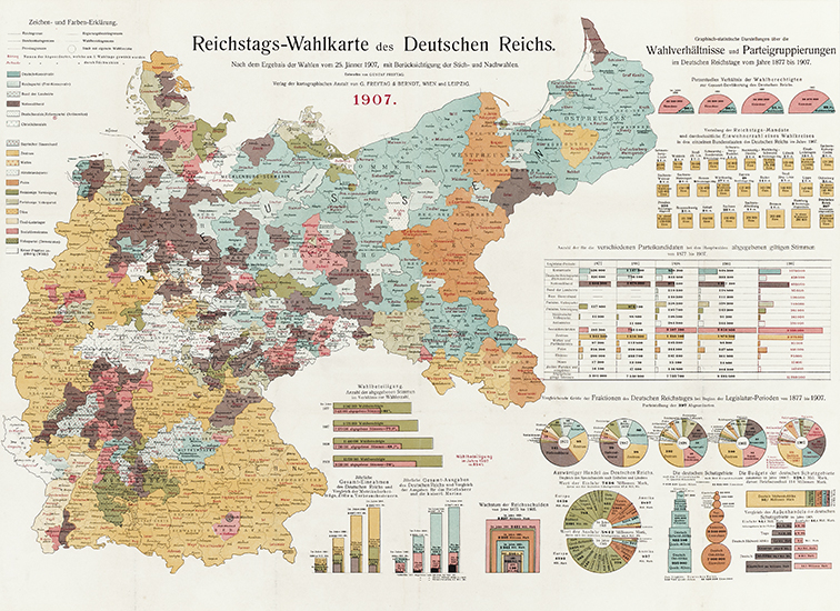 rechts: Graphisch-statistische Darstellungen über die Wahlverhältnisse u. Parteigruppierungen im Deutschen Reichstage 1877-1907