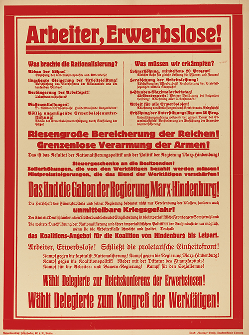 142 Arbeiter, Erwerbslose! … Regierung Marx-Hindenburg ... Wählt Delegierte zum Kongreß der Werktätigen!